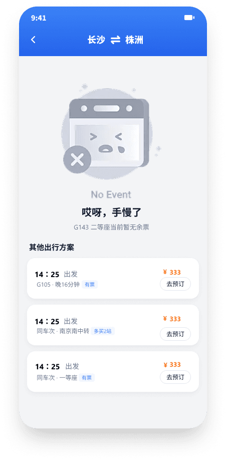 首页的查询卡片设计极简:选出发地、目的地、日期,点一下就出结果。结果列表重点突出出发时间和价格,余票状态一目了然,告别 12306 的信息过载。