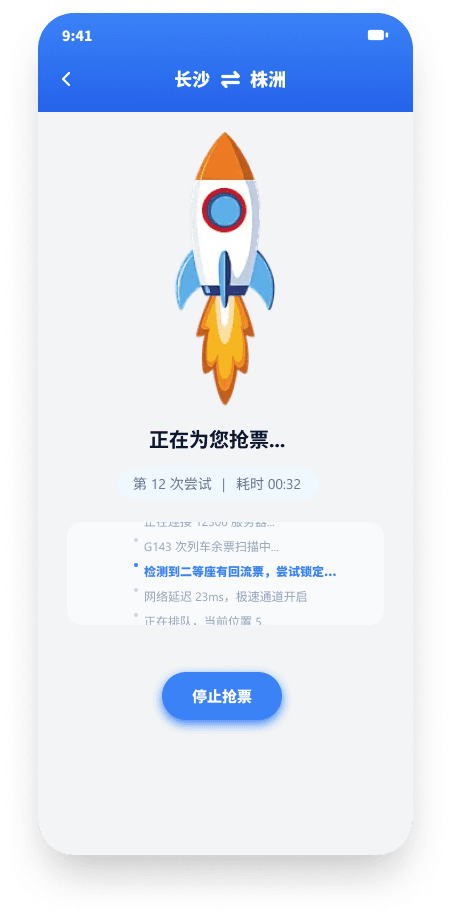 抢票过程以火箭动画 + 实时日志营造紧张感与仪式感:显示当前已尝试次数、耗时、余票扫描状态、网络延迟和排队位置,让用户感知抢票进展而非干等。失败后友好提示并推荐备选方案。