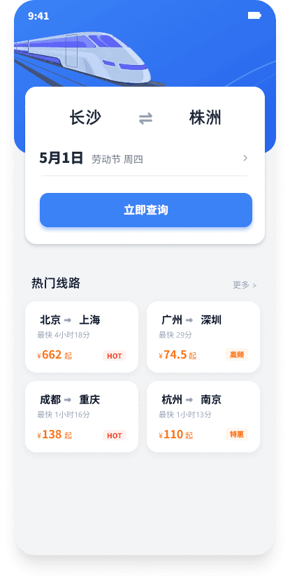 顶部蓝色渐变区展示高铁插图,中部为出发地 / 目的地选择卡片和日期选择,一键发起查询。下方列出热门线路,附最快用时、起价及标签(HOT / 高频 / 特惠),帮助用户快速决策。