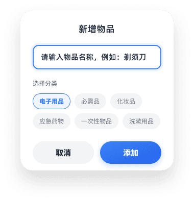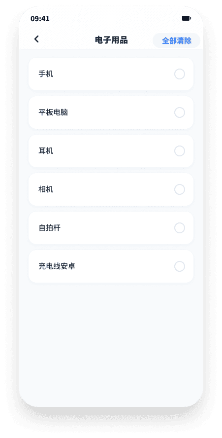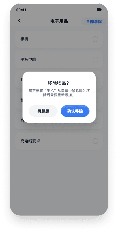 出行前的行李检查是容易被忽视的场景。App 提供按类别管理的物品清单,用户可添加自定义物品、长按删除或一键清空。分类涵盖电子用品、必需品、化妆品、应急药物、一次性物品、洗漱用品,覆盖大多数出行场景。
