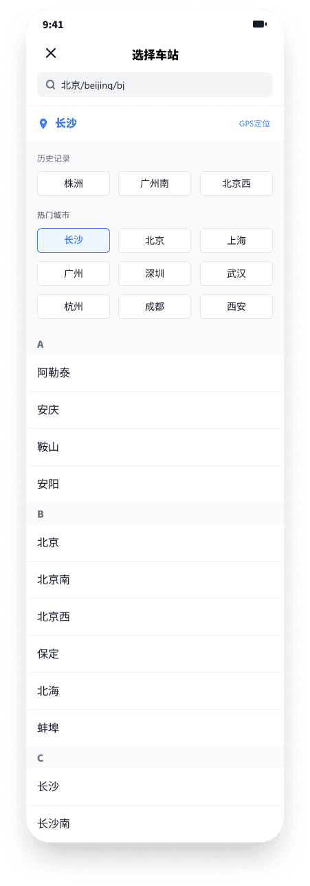 点击出发地或目的地后弹出车站选择页,支持拼音 / 汉字搜索,显示历史记录和热门城市快捷入口,同时提供 GPS 自动定位当前城市,列表按字母排序覆盖全国站点。