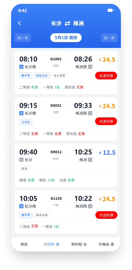 查询结果以列表展示,每条信息清晰呈现:出发 / 到达时间、车次、历时、票价,以及各座位档次的余票状态(有票 / 张数 / 无票)。底部支持按时间、耗时、价格多维排序,右上角可发起光速抢票。