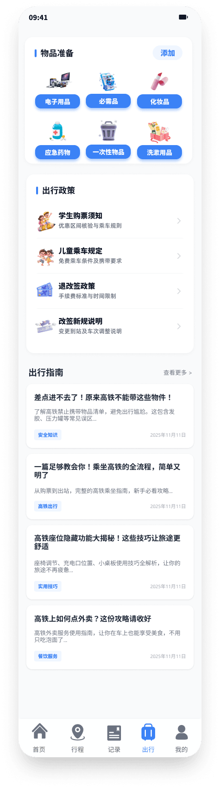 内置常见政策速查(学生票、儿童票、退改签),以及禁带物品、乘车全流程、座位选择技巧、车上外卖等实用文章,帮助新手用户顺利完成第一次高铁出行。